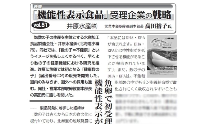 塩数の子の生産を主体とする水産加工食品製造会社・井原水産㈱(北海道小樽市)。同社では、「数の子=不健康」というイメージを払しょくするべく、早くより数の子の健康機能における研究を推進。昨夏に魚卵では初となる『健康数の子』(届出番号C2)の販売…