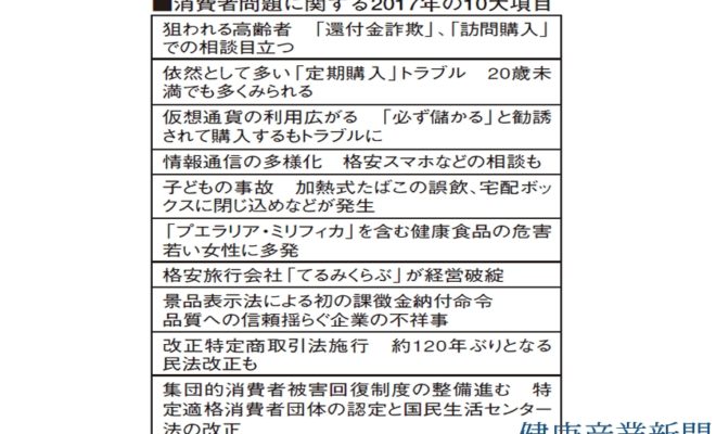 国民生活センターは先月21日、消費者問題に関する2017年の10大項目を発表した。同センターでは毎年、社会的注目を集めた事例や、相談が多い事例のなかから「10大項目」を選び、発表している。高齢者を狙った還付金詐欺や、仮想通貨…