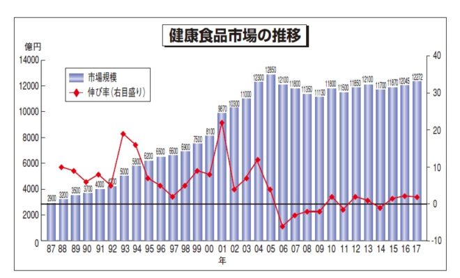 2017年の健康食品市場規模は、本紙のまとめで前年比1.9%増の1兆2,272億円となった。ピークだった05年の1兆2,850億円には届かないものの、調査開始以降で3番目に高い水準を記録。店舗数が増加したドラッグストアがインバウンド需要も重…