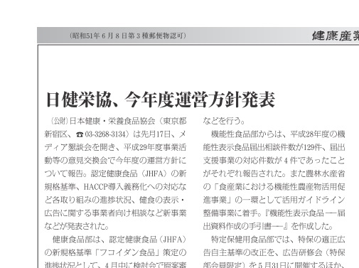 (公財)日本健康・栄養食品協会(東京都新宿区、 03-3268-3134)は先月17日、メディア懇談会を開き、平成29年度事業活動等の意見交換会で今年度の運営方針について報告。認定健康食品(JHFA)の新規格基準、HACCP導入義務化への対…