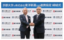 東洋新薬は29日、京都大学との連携協定に調印した。シーズ探索や共同研究だけでなく、京大が持つ特許の技術移転(ライセンシング)、京大発ベンチャーとの連携(アライアンス)などを盛り込んだ包括的な内容。