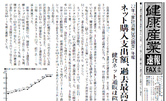 ・22年「家計消費状況調査」年報 ネット購入支出額、過去最高に 健食ネット通販は微減・機能性表示食品、NMN受理・フェムケア・フェムテック、リアル店舗に拡大で市場活性化・都、4月の健食相談63%増・米CRN、…