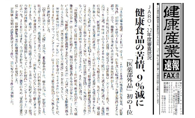 ・JARO・22年度審査状況 健康食品の苦情、9%減に・DgS4月、健食販売額5・6%増 プロテイン等好調・健食の通販購入率、男女とも70代1位 通販協報告書・機能性表示食品6300品に・3歳半時の腸内細菌叢…