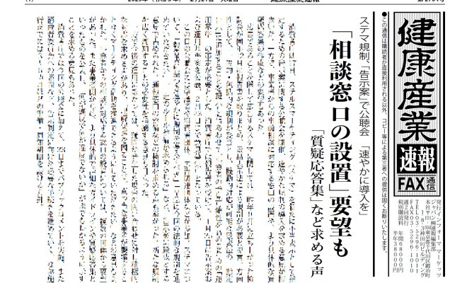 ・ステマ規制、「告示案」で公聴会 「速やかに導入を」 「相談窓口の設置」要望も・食薬区分改正、医薬品リストに「ビンポセチン」追加・大阪府、健食試買で「ビンポセチン」検出・機能性表示、今年度1000品突破 計5843品…