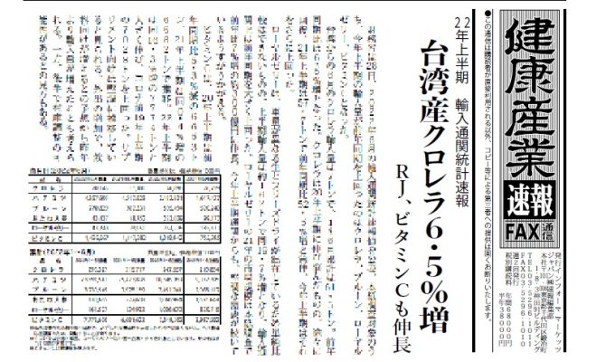 ・22年上半期 輸入通関統計速報 台湾産クロレラ6・5%増・都、ネット広告監視で234事業者に改善指導・「新油」市場280億円に・米国違法サプリ、FDA警告後も一部是正されず・SNSきっかけのトラブル、相談過…