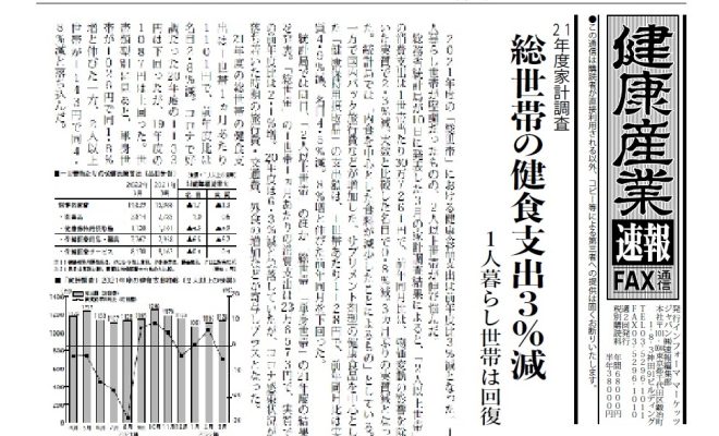 ・総世帯の健食支出3%減・21年度「総世帯」健食ネット通販支出、2%増に・米FDA、偽の「FDA承認」表示に注意喚起・ベジタリアン・ヴィーガン加工食品でJAS規格案・DHA・EPAが胃の過剰収縮抑制 東邦大…