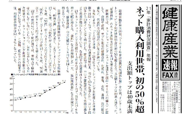 ・21年「家計消費状況調査」年報 ネット購入利用世帯、初の50%超・米国、FDAを「食品」「医薬品」で分離する法案・定期購入トラブル、電子タバコや医薬品でも・天猫国際、善玉菌の国際プラットフォーム発足・東洋ビ…