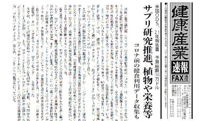 ・米国ODS、21年報告書 予算総額1940万ドル サプリ研究推進、植物や栄養等・消費者庁、特保・機能性表示食品等の関与成分調査・米国プラントベース市場、過去最高の74億ドル・静岡県、「茶の機能性」で研究成果集…