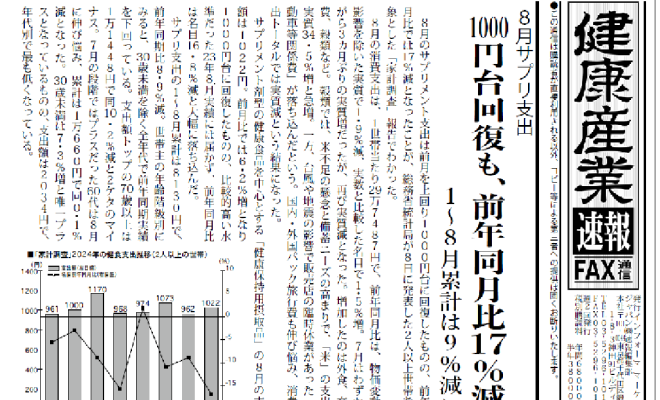 ・8月サプリ支出 1000円代回復も、前年同月比17%減・健食ネット通販支出、14ヵ月ぶりマイナス 8月統計・ベトナムでFi展開幕、日本からも複数出展・PHR社会実装加速化、経産省がユースケース発表会・健食利…