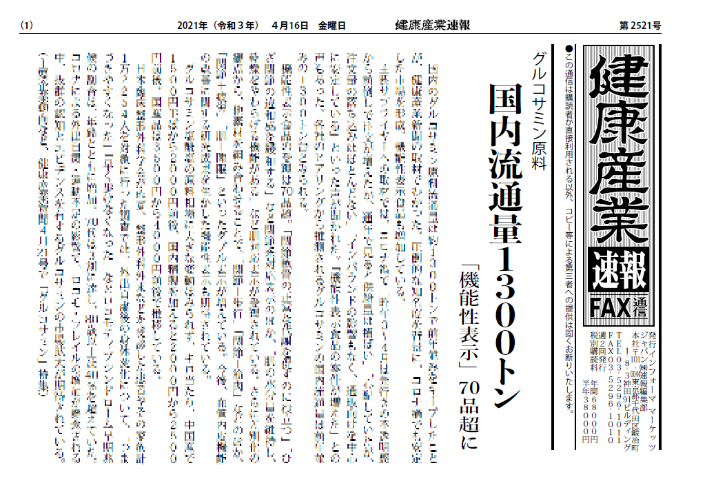 ・グルコサミン原料 国内流通量1300トン・機能性表示、20年度1000品の大台に・特保2品許可、計1073品に・米国スポーツサプリ伸長、24年に500億ドル市場へ・都の健食相談、1月は前年同月比56%減 減…