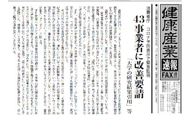・消費者庁 コロナ予防表示で緊急監視・機能性表示食品、3700品突破・大麻草の部位規制撤廃へ、厚労省検討会とりまとめ・グルコサミンで膨満感軽減、便秘解消 海外研究・都、「悪質事業者」通報件数26%増 半数が通…