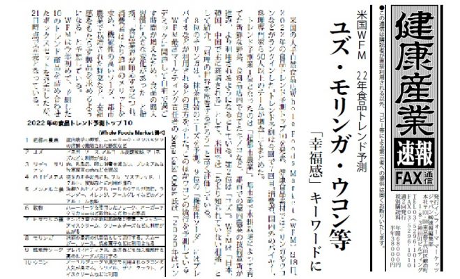 ・米国WFM 22年食品トレンド予測 ユズ・モリンガ・ウコン等・都が講習会、薬機法の留意点など解説・機能性表示食品4102品に・特保1品許可、計1072品に・電解水透析、重度の疲労感「ほぼ消失」 聖路加国際病…