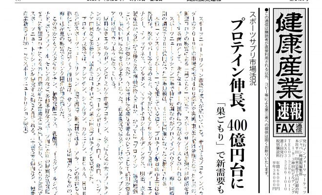 ・スポーツサプリ市場活況 プロテイン伸長、400憶円台に・機能性表示2655品に、マグロたたきなど受理・外出自粛、サプリなど通販トラブル増加・果実等のフラボノイドにアルツハイマー病予防効果・食品産業センター、…