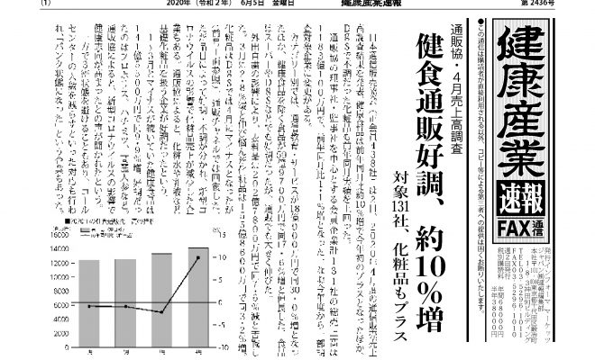 ・通販協・4月売上高調査 健食通販好調、約10%増 対象131社、化粧品もプラス・ブドウ種子でサプリ生産開始 豪の非営利組織ら・魚エキスが糖尿病網膜症の進行抑制 慶應大など・消費者委、特保申請1品「問題なし」…