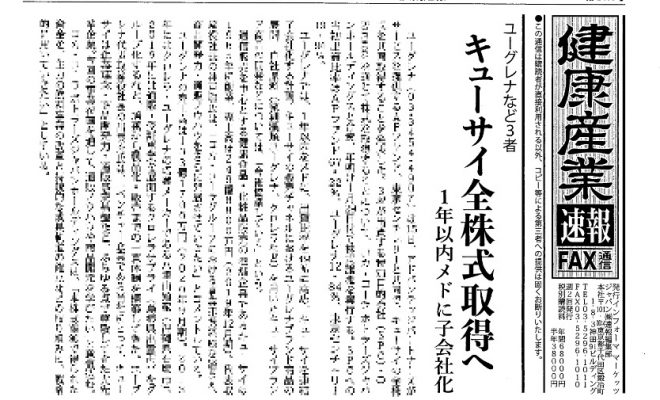 ・ユーグレナなど3社 キューサイ全株式取得へ・「γ-オリザノール」含む商品受理 SBIアラプロモ・米CHPA、サプリ「義務製品リスト」導入呼びかけ・ココカラファイン、新宿に大型旗艦店・新型コロナ受け、英でVD…