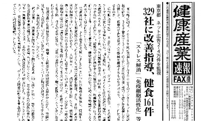 ・東京都 ネット広告2・4万件を監視 329社に改善指導、健食161件・弁護士・成氏、健康業界の広告「規制強化の流れに」・米GNC、ハルビン製薬への事業売却承認・日本ブランド育成支援事業、サプリ市場開拓など・…