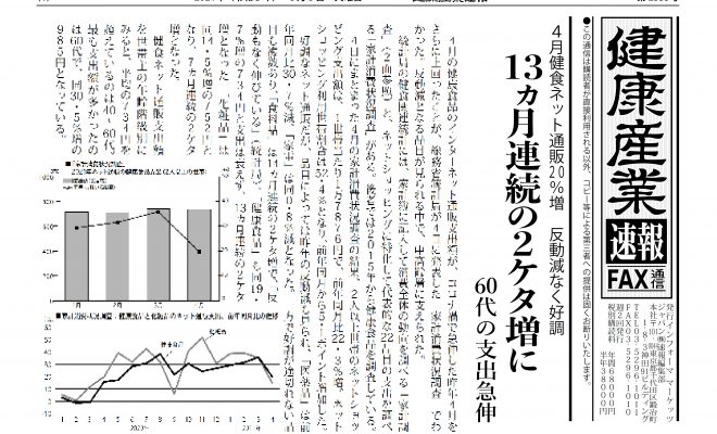 ・4月健食ネット通販20%増 反動減なく好調・4月家計調査、健食支出4%減・機能性表示3667品に・中国、20年の保健食品「届出」2300件 免疫サプリ増・米国4業界団体、健食市場監視の予算アップ要請…