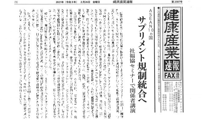 ・ASEAN10カ国 サプリメント規制統合へ・高麗人参、市場規模250億円 免疫対策で再評価・機能性表示38品受理、計3400品に・アイルランド、有害事象を統合管理するシステム開発・ファンケル、関西に物流拠点…