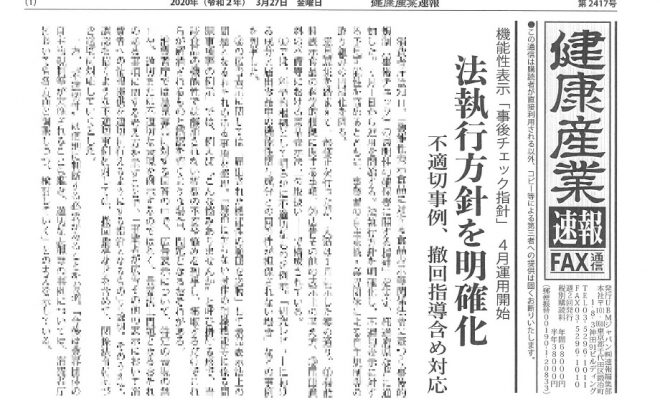 ・機能性表示「事後チェック指針」4月運用開始 法執行方針を明確化・北海道、初のヘルスケア企業ガイド 健康食品は35社・都の健食試買、「抗ウイルス作用」等の不適正表示・四国健康支援食品制度、3品を認証・台湾、一…