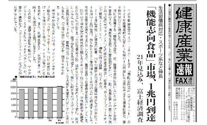 ・「機能志向食品」市場、1兆円到達 21年見込み、富士経済調査・米自然食品店、22年栄養製品トレンド1位「健康寿命」・健食摂取者、利用目的1位「健康維持増進」 矢野経済・農商工連携につながる新技術説明会、12月にオン…