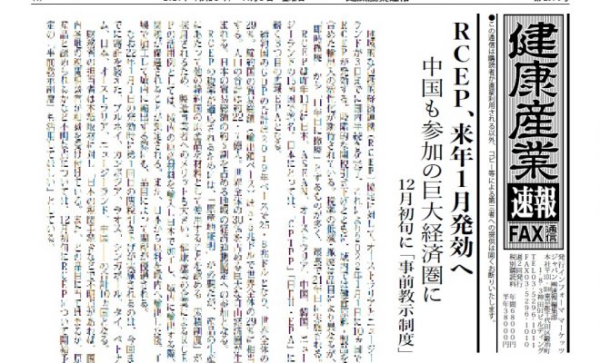 ・RCEP、来年1月発効へ 中国も参加の巨大経済圏に・9月の健食通販4%増、健康茶など好調・米国アマゾン、減量サプリ等の出品に成分検査要求・国セン、飲料のカフェイン含有量を調査・特保1品許可、計1070品に…