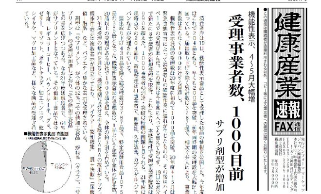 ・機能性表示、4~5月大幅増 サプリ剤型が増加 受理事業者数、1000目前・小学生のサプリ利用率7%、スポーツの実施頻度影響・ヘルスリテラシー、日本が最下位 14ヵ国対象・特保1品許可、計1075品に・ファー…