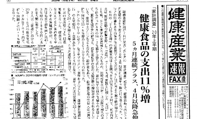 ・「家計調査」20年上半期健康食品の支出11%増・初の「免疫」機能性表示受理 キリングループ・6月の健食ネット通販28%増、3カ月連続の2ケタ増・オランダ団体、ブロックチェーン技術でCBD製品管理・医療機関向…
