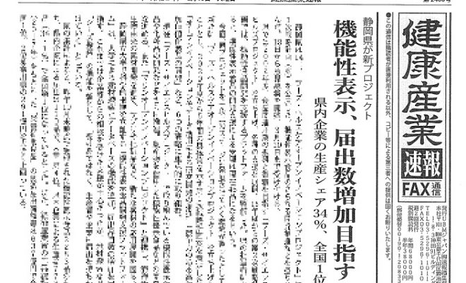 ・静岡県が新プロジェクト 機能性表示、届出数増加目指す・乳酸菌市場拡大、8000億円規模に・特商法違反、電話勧誘販売企業に行政処分・機能性表示食品2494品に・東洋新薬、「インテリジェンスパーク」でcGMP認…
