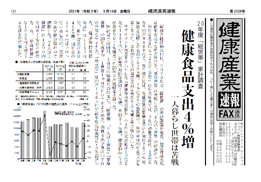 ・21年上半期の家計調査 健康食品支出3%減・21年上半期、健食ネット通販支出21・5%増…