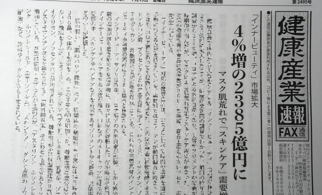 ・「インナービューティ」市場拡大 4%増の2385億円に・オメガ3、高齢者の筋肉量・歩行速度改善 台湾研究・特商法違反、健食通販企業に3カ月の一部業務停止命令・2月に地域農林水産物等の機能性発掘シンポジウム・…