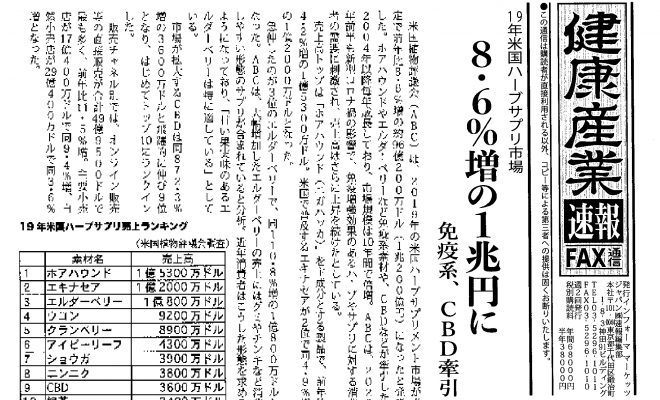 ・19年米国ハーブサプリ市場 8.6%増の1兆円に・コロナで変わるネット通販、健食・化粧品の支出増・高齢者のフレイル割合8.7% 都健康長寿医療センター・20年上半期ドイツのサプリ市場、8%増の1400億円・…