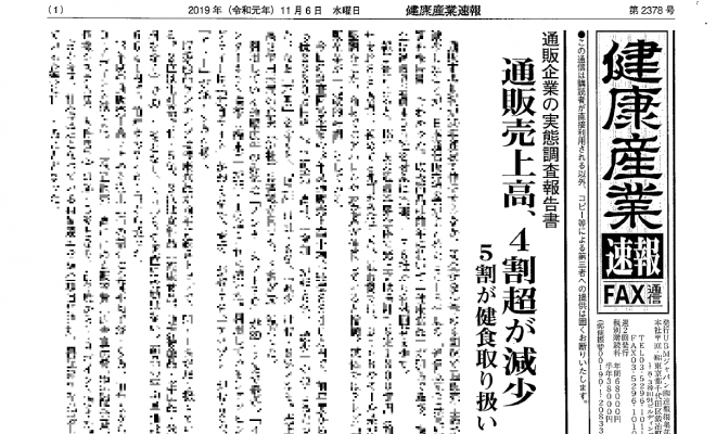 ・通販企業の実態調査報告「通販売上高、4割超が減少」・第2回抗酸化・機能研究会「食品の機能性可視化重要」・HPで「免疫高める」等と表示、景表法違反で措置命令・機能性食品2267品に・通販市場、増税前の駆け込み…