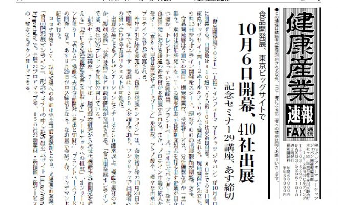 ・食品開発展、東京ビッグサイトで 10月6日開幕、410社出展・米・議会調査局、サプリ規制でレポート・プレバイオが体内時計の乱れ修復 コロラド大研究・コホート研究、GI高いグループで全死亡リスク高く・帝人、バ…