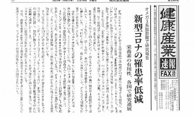 ・オメガ3系脂肪酸で研究報告 新型コロナの罹患率低減・健康サポート薬局、認知度8% 内閣府調査・20年化粧品市場、国内販売・輸入実績とも2桁減・機能性表示3337品に・中国、魚油などに「暫定関税率」採用…