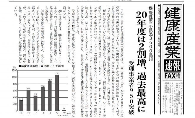 ・機能性表示食品3600品超 20年度は2割増、過去最高に・21年通販・EC市場、10%増15兆円超の見込み 富士経済・秋田県・総食研が基本計画、機能性食品の開発支援等・米国FDA21年度予算、CBDの製品検査継続…