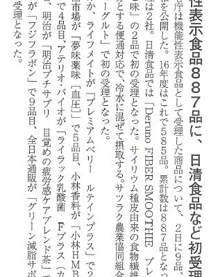 消費者庁は機能性表示食品として受理した食品について、2日に9品、8日に1品の情報を公開した。16年度はこれで585品。累計数は887品となった。初受理は2社。日清食品では『Deruno FIBER SMOOTHIE プレーン』『同青リンゴ味…