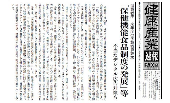 ・消費者庁 来年度の予算概算要求「保健機能食品制度の発展」等・DgS7月、健食好調 5ヵ月連続のプラス・ハーブ成分、パーキンソン病予防の可能性 米国研究・中国、「アクティブシニア」市場に商機・7月輸入通関、ビ…