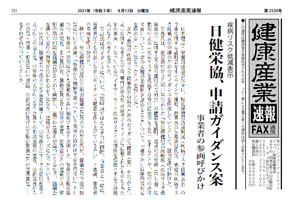 ・疾病リスク低減表示 日健栄協、申請ガイダンス案・米国、43%の親が子どもに免疫サプリ・健食支出、50代のペースダウン目立つ・食品安全委、動画で健食に関するメッセージ・ホルス、発酵プラセンタに抗疲労作用…
