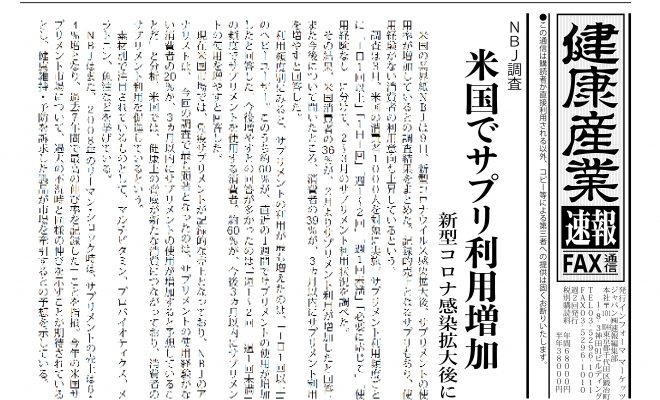・NBJ調査 新型コロナ感染拡大後に 米国でサプリ利用増加・コロナ拡大受け、食品表示基準を弾力的運用・農水省、フードテック研究会設置 たんぱく質供給を議論・特保1品許可、計1072品に・野菜摂取多い男性、白内…