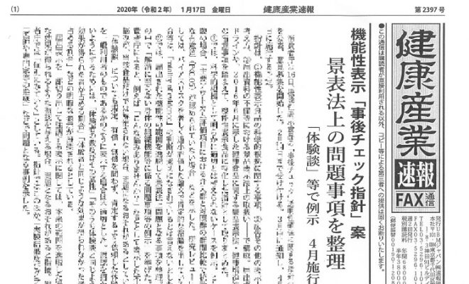 ・機能性表示「事後チェック指針」案 景表法上の問題事項を整理・「指定成分」に対応、食品表示基準を一部改正へ・訪日観光客、健食で購入トラブルも 国セン・特商法違反、電話勧誘販売企業に6ヵ月の業務停止命令・厚労省…